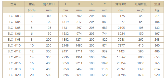 自清洗過濾器ELC-HC-K 發布時間:2019-03-25 16:01 作者:敘述織夢 來源:未知 點擊: 字號:大中小 技術參數 單臺處理水量:45-2350m³/h 最大工作壓力:0.1-1.6Mpa 過濾器清潔時的壓力損失:≤0.018Mpa 最高工作水溫:95℃ 過濾精度范圍:100-3000μm 自清洗所需水量:<1% 自清洗時間:10-60秒 自清洗控制方式:壓差、時間及手動 電控方式:交流三相380V/ 50Hz 控制界面:數顯、旋鈕、開關 濾網類型:316L編織網、楔形網 尺寸對照表 安裝圖 上一篇:自清洗過濾器ELC-JC-X 下一篇:自清洗過濾器ELC-GC-US