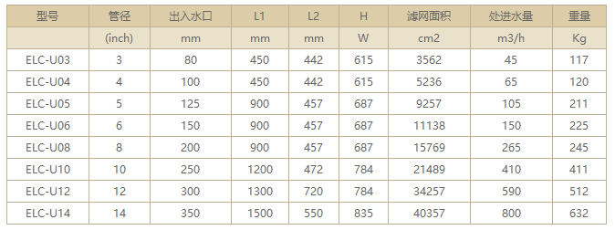 自清洗過濾器ELC-FC-U 發布時間:2019-03-25 16:06 作者:敘述織夢 來源:未知 點擊: 字號:大中小 技術參數 單臺處理水量:45-800m3/h 最大工作壓力:0.1-1.6Mpa 過濾器清潔時的壓力損失:≤0.018Mpa 最高工作水溫:95℃ 過濾精度范圍:10-3000μm 自清洗所需水量:<1% 自清洗時間:10-60秒 自清洗控制方式:壓差、時間及手動 電控方式:交流三相380V/ 50Hz 控制界面:數顯、旋鈕、開關 濾網類型:316L編織網、楔形網 尺寸對照表 安裝圖 上一篇:自清洗過濾器ELC-GC-US 下一篇:自清洗過濾器ELC-EC-D